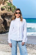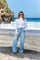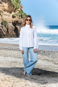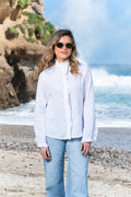 Blusa blanca con cuello mano y vuelos en el borde por los botones.