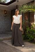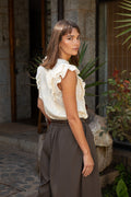 La Blusa Catemu está confeccionada en 100% algodón, una fibra natural que entrega frescura, suavidad y comodidad para el uso diario. Su diseño destaca por un escote en V con cuello mao, acompañado de bordados en el mismo tono con mini lentejuelas doradas que aportan un brillo sutil y elegante. Los vuelos en los hombros y en el escote añaden movimiento y un toque romántico a la prenda. Disponible en color beige y tallas S, M y L, es ideal para combinar con pantalones o faldas en looks casuales o más sofisticados.