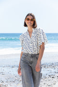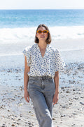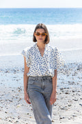 Blusa cuello mao con vuelos, escote en V y estampado de corazones azules.