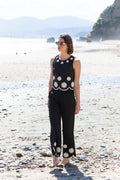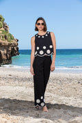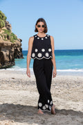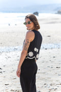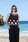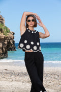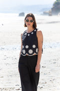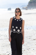 Top negro con cuello redondo , sin mangas y flores bordadas blancas. Talla S,M, L