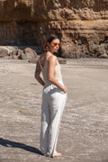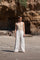 Pantalón de tela beige con pinzas y elasticado la parte de atrás. Talla SM y ML.