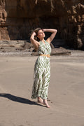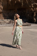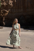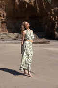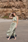 Vestido largo estampado con cinturón , amarrado al cuello. Talla única.