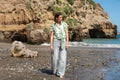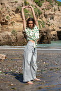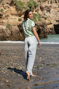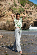 Blusa color crema con hojas estampadas, manga corta y nudo a la cadera